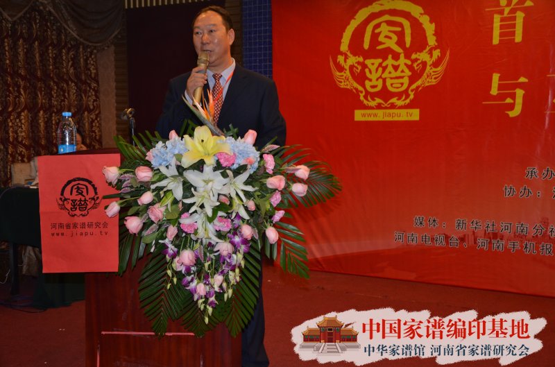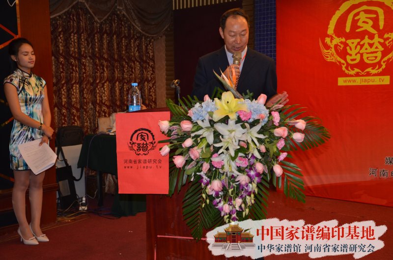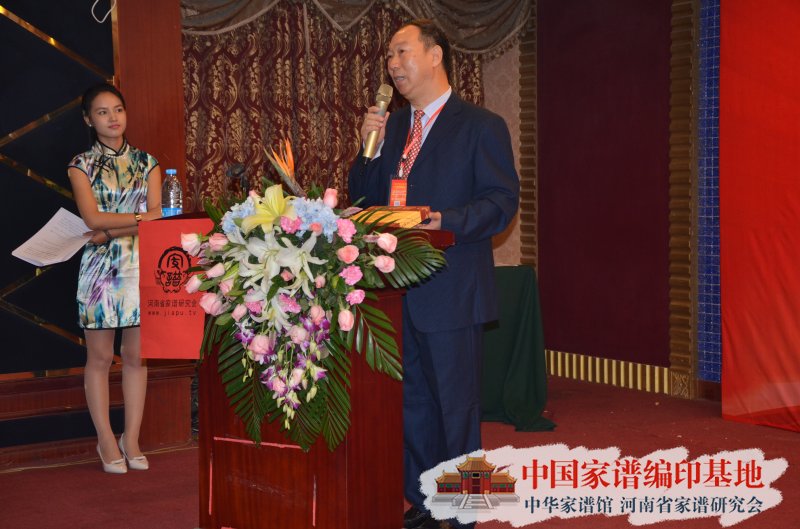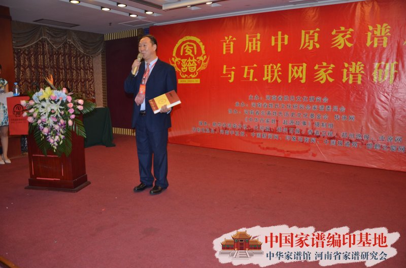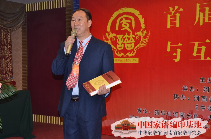 魏怀习会长向与会者介绍我会最新出版的《家谱编修实用大全》一书